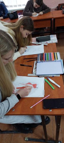 Викладач предмета «Спеціальне малювання» Марина Шелепець та практичний психолог Леся Зизич провели інтегроване заняття у групі №23 за професією «Швачка. Кравець» В ході якого, здобувачі освіти ознайомилися з методами арт-терапії та закріпили знання з технічного моделювання одягу. Під релаксуючу музику дівчата охоче створювали ескізи модних суконь.